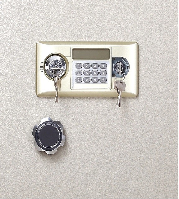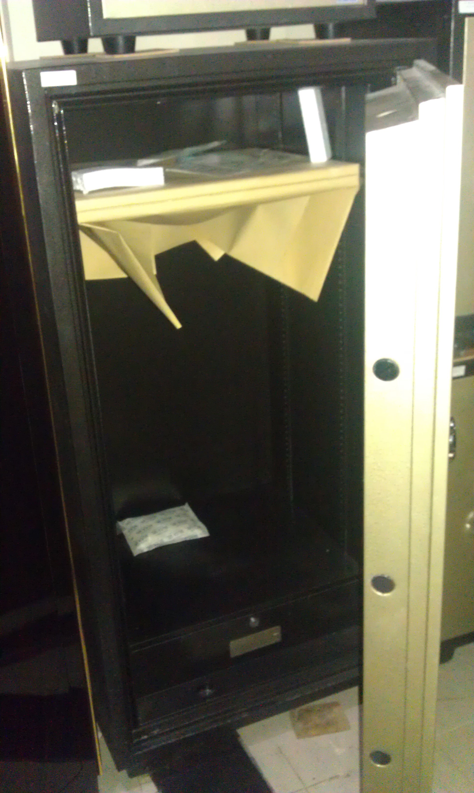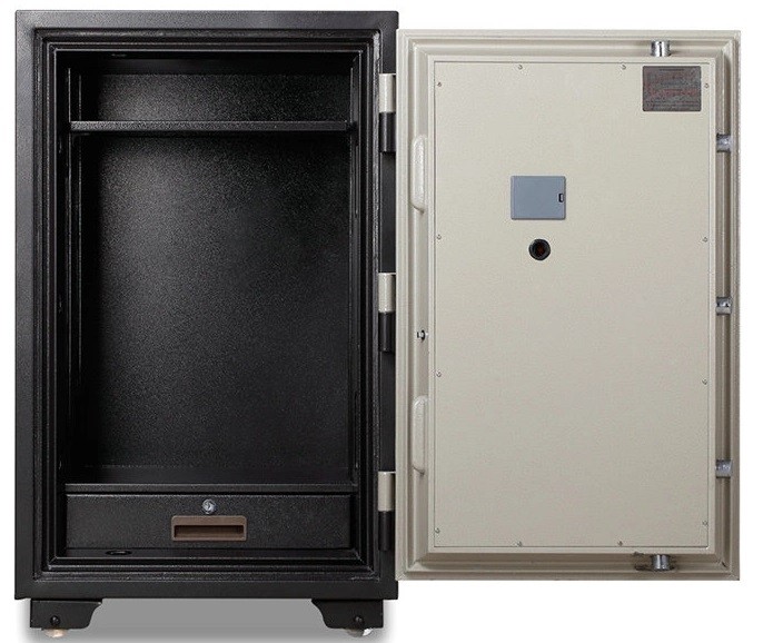 Special fireproof stuffing material and passed UL test. Electronic locking system, with alarm system, shelf and drawer. UL Certified for 1-Hour Fire-Resistant. H: 51.5" W: 28" D: 25.5"